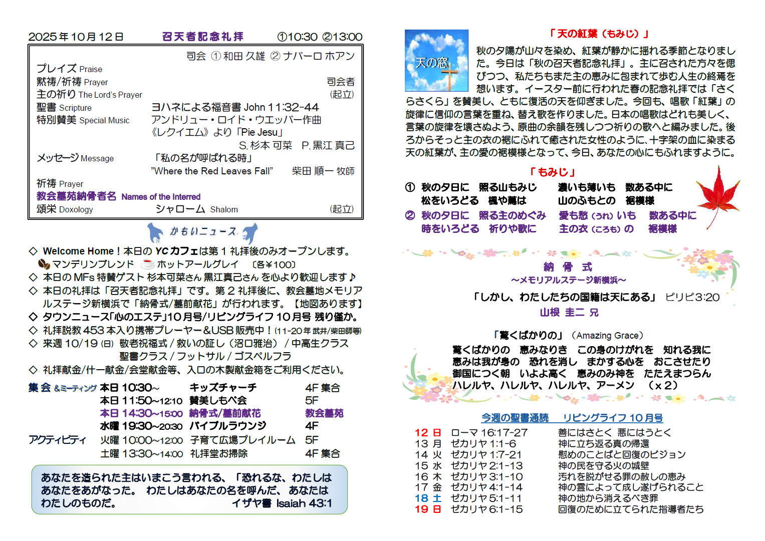 12 日 召天者記念礼拝(柴田牧師)[特別賛美ゲスト] S. 杉本可菜 P. 黒江真己