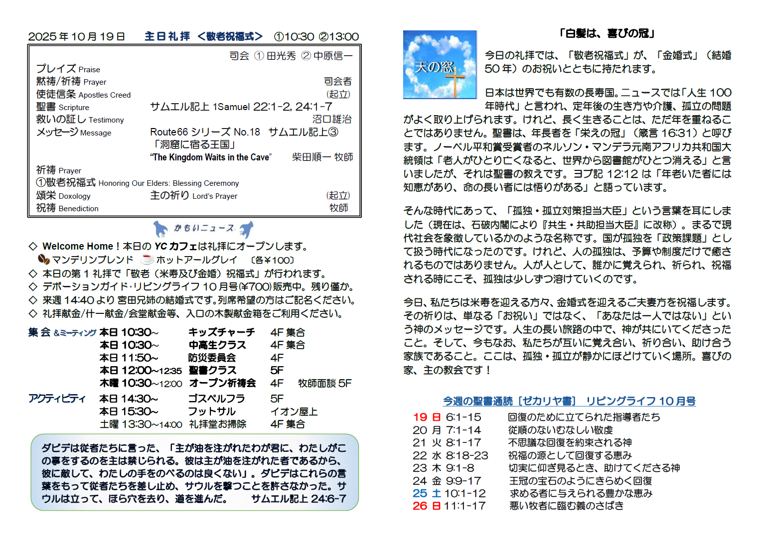 19 日 主日礼拝<敬老祝福式>(柴田牧師 救いの証し:沼口雄治)/中高生クラス /聖書クラス/フットサル/ゴスペルフラ