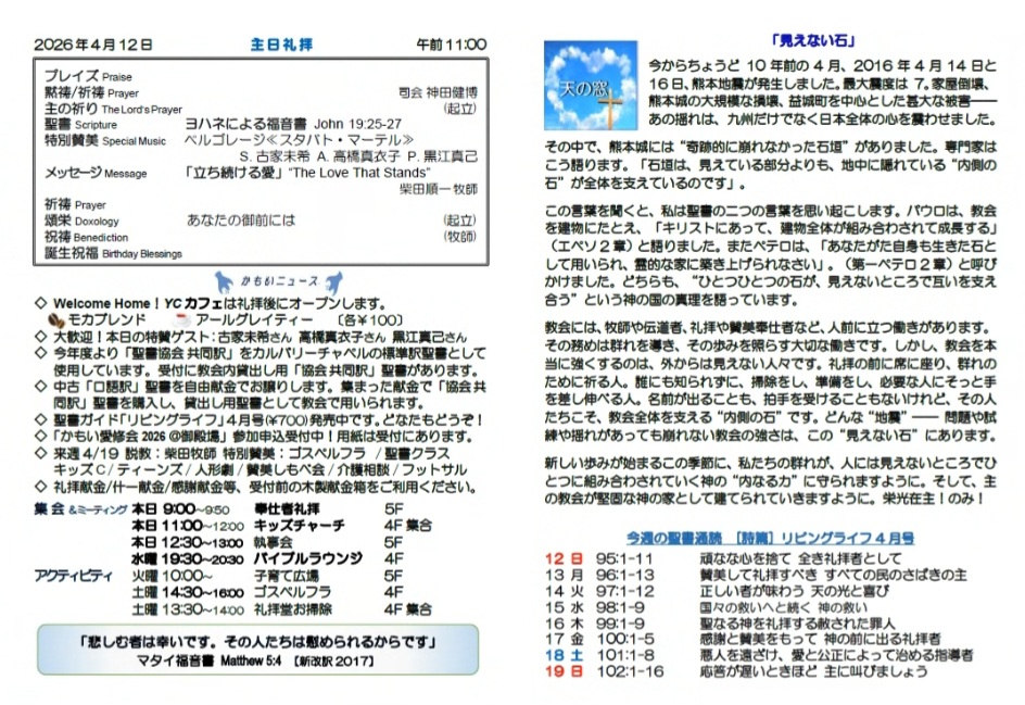12 日 主日礼拝(柴田牧師)特別賛美:S. 古家未希 A. 高橋真衣子 P. 黒江真己 / 執事会 / Mtf