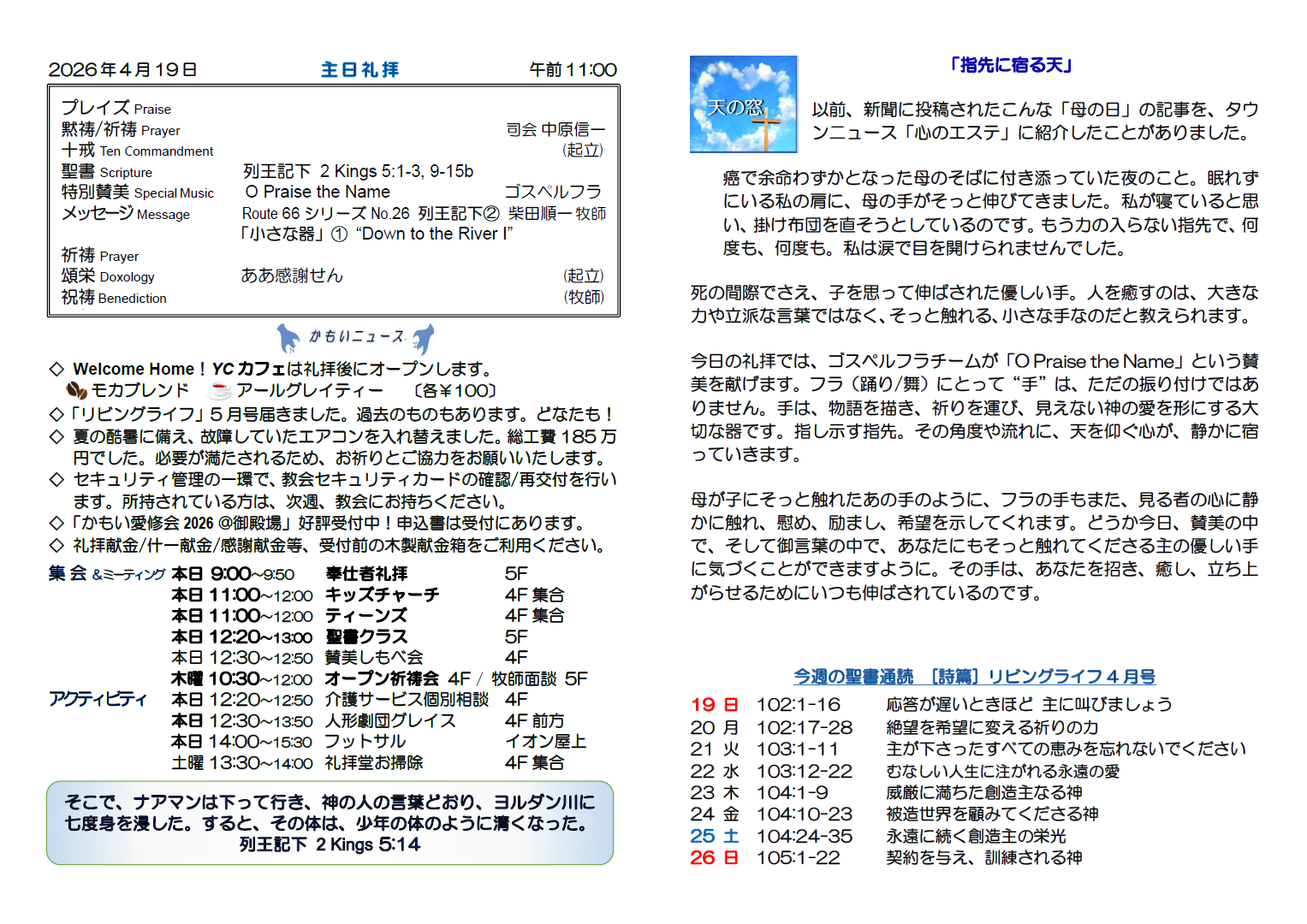 19 日 主日礼拝(柴田牧師 / 特別賛美:ゴスペルフラ)/ ティーンズ / 聖書クラス / 人形劇 / 賛美しもべ会 / フットサル