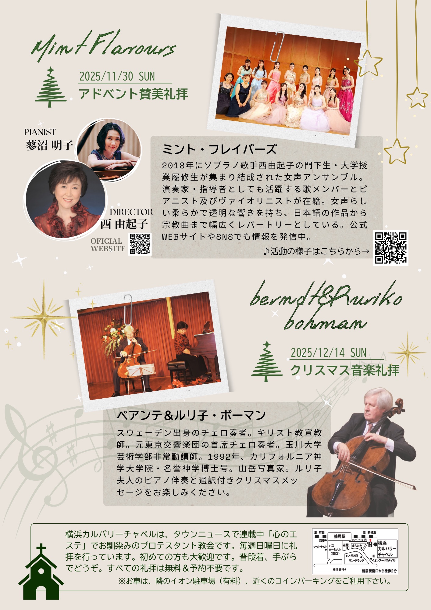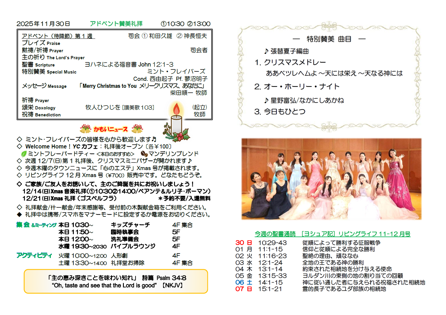 30 日 アドベント賛美礼拝(柴田牧師/アドベントT) ミント・フレイバーズ(Cond. 西由起子 Pf. 蓼沼明子)/Mfs